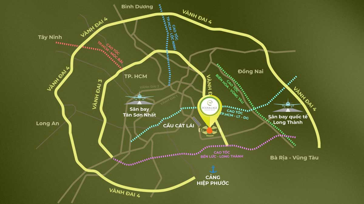 Dự án Ecopark Nhơn Trạch nằm trên trục đường cao tốc Bến Lức - Long Thành, kết nối thuận tiện với trung tâm thành phố Hồ Chí Minh và các khu vực lân cận. Từ dự án, cư dân có thể dễ dàng di chuyển đến các khu vực trung tâm thành phố thông qua các tuyến đường huyết mạch như cao tốc Long Thành - Dầu Giây, Quốc lộ 51, cao tốc Bến Lức - Long Thành,...
